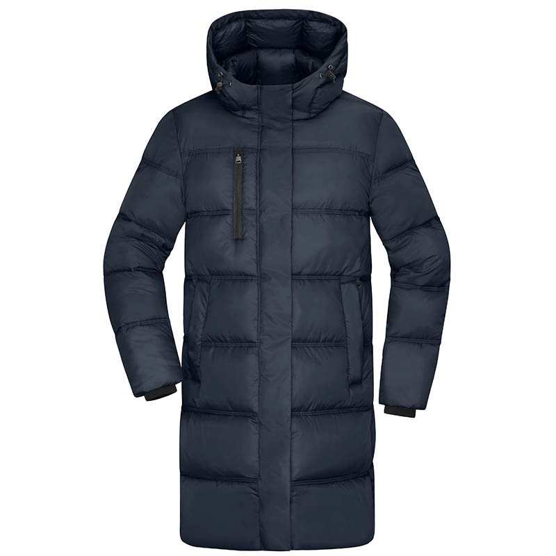 NOVINKA 2024. Longer padded jacket with two-way zipper. Detachable hood, which is adjustable with elastic cords. Ribbed collar and rib ending at the sleeves. Two side pockets with zippers. One chestpocket on the inside with zipper. Soft knitted fabric on the inside of the side pockets. Colors: 600 navy, 900 black Outerfabric: 100% Recycled Polyester, 67 g/m2 (GRS) Padding: 100% Recycled Polyester Repreve Padding (Bluesign), 160 g/m2 in body, 140 g/m2 in sleeves Lining: 100% Recycled Polyester, 35 g/m2 (GRS) XS-XXL
