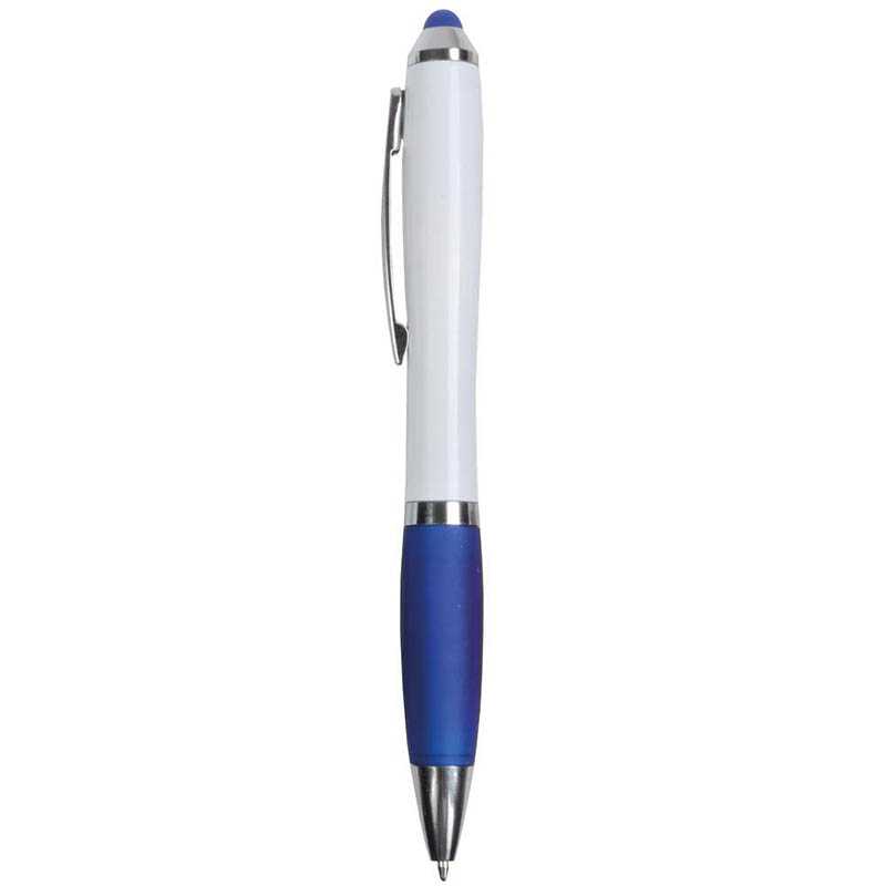 Blue ink ballpoint pen with coloured barrel, rubber grip, glossy accents, recess in metal clip and rubber top/pointer to operate touch screens (eg iPhone/iPad).