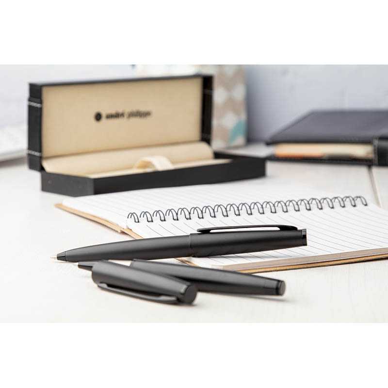 Elegantná sada kovového guľôčkového pera a roller pera v čiernej matnej úprave. V špeciálnej papierovej darčekovej krabičke a s modrou náplňou. Značkový produkt André Philippe.