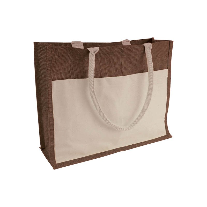 Jute shopping bag with gusset, handles and front pocket in natural cotton