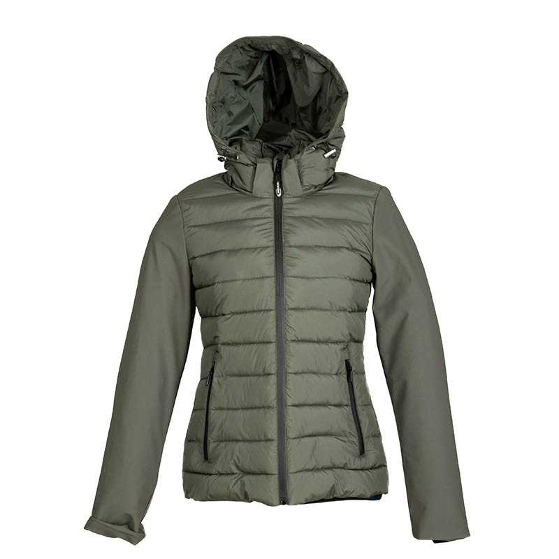 NOVINKA 2025. Jacket in composite fabric - Front and hood in polyester pongee - Water-repellent with soft polyester padding (feather effect) - Sleeves and back in 3-layer softshell fabric - Waterproof 3000 mm/H2O, - Breathability 1000 g/m2/24h - Anti-pilling microfleece lining - Inner fabric under the collar that can be lifted for customization - Waterproof laser-cut zips - Central zip with internal windproof fabric - Chin protection fabric - Padded detachable hood with flap and drawstring adjustment - Two large external pockets with zip - One internal wallet pocket with zip - Windproof stretch fabric inside the cuffs