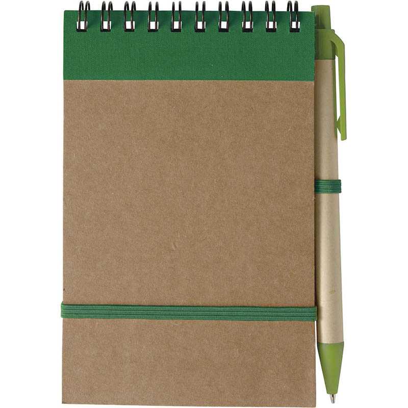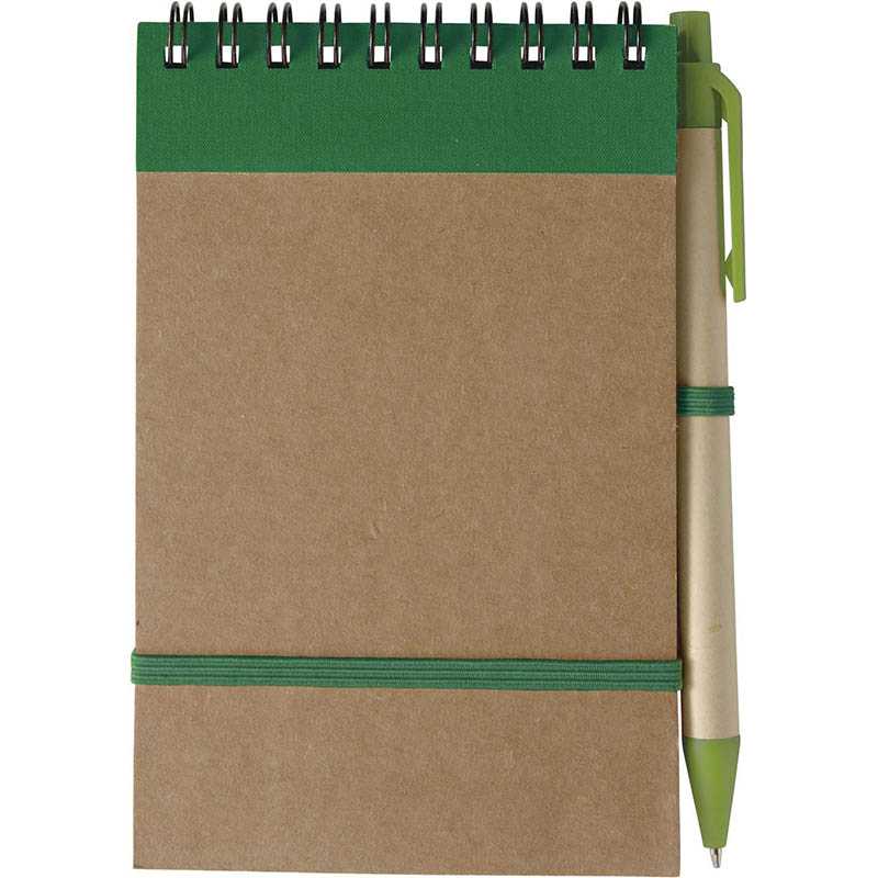 Recycled cardboard, wire bound notebook with 70 lined sheets, a retractable ballpen with blue ink and elastic over the cover.