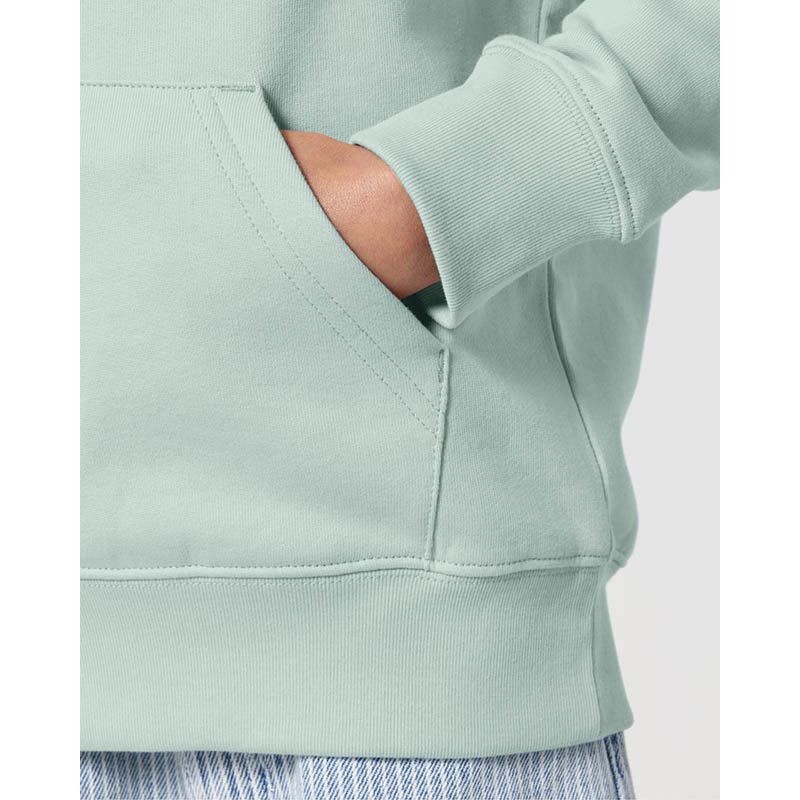 Mikina s kapucňou a česanou podšívkou. Kapucňa z dvojvrstvového materiálu so širokou šnúrkou. Vonkajšie vrecko vpredu, 2x2 rebrovanie na okraji rukáva a spodnom leme. Moderný strih. Materiál: 80% organická bavlna 20% recyklovaný polyester. Gramáž: 280 g/m2. Certifikáty: GOTS, Fairtrade Cotton, Nordic Swan Ecolabel, Oeko-Tex