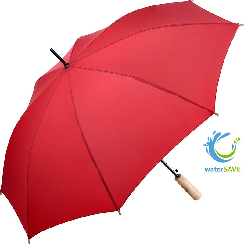 Convenient automatic function for quick opening, Windproof system for higher flexibility and stability in windy conditions, flexible fibreglass ribs, polyester pongee cover material made of recycled plastics, depending on the colour, also available with waterSAVE® cover material and with waterSAVE® label on the closing strap (with new deliveries), wooden tips, straight wooden handle with promotional labelling option, higher corrosion protection due to galvanized steel shaft