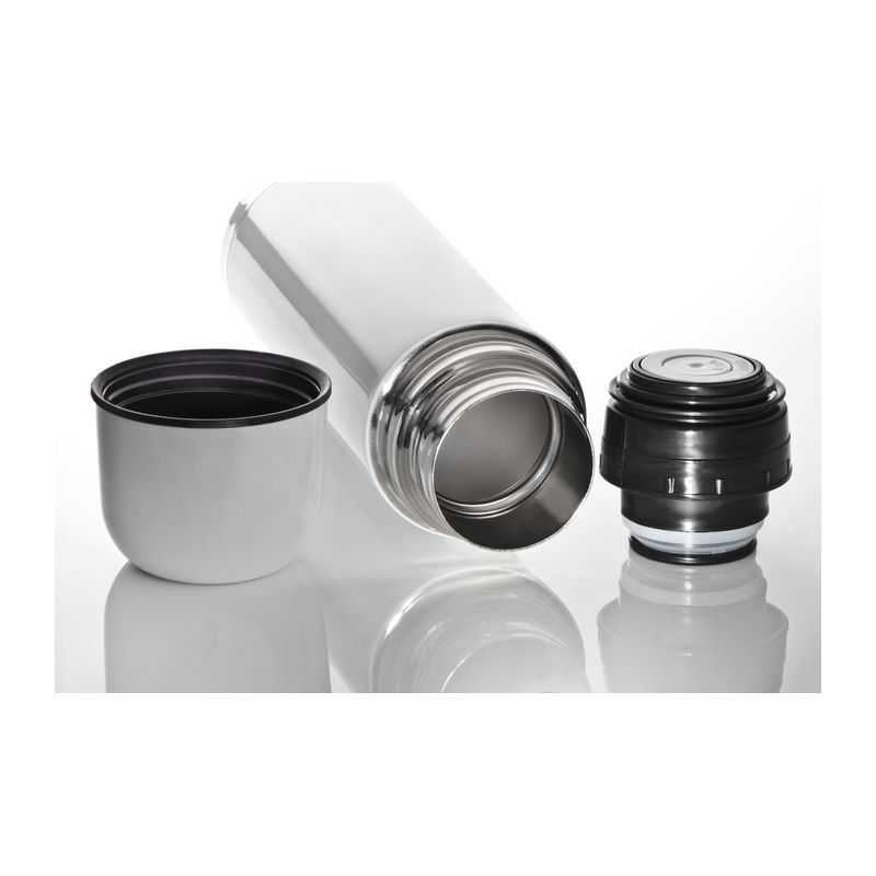 Malá nerezová termoska s objemom 500ml, nepriepustná, vákuovo izolované dvojité steny. Vrchnák slúži aj ako pohár.
