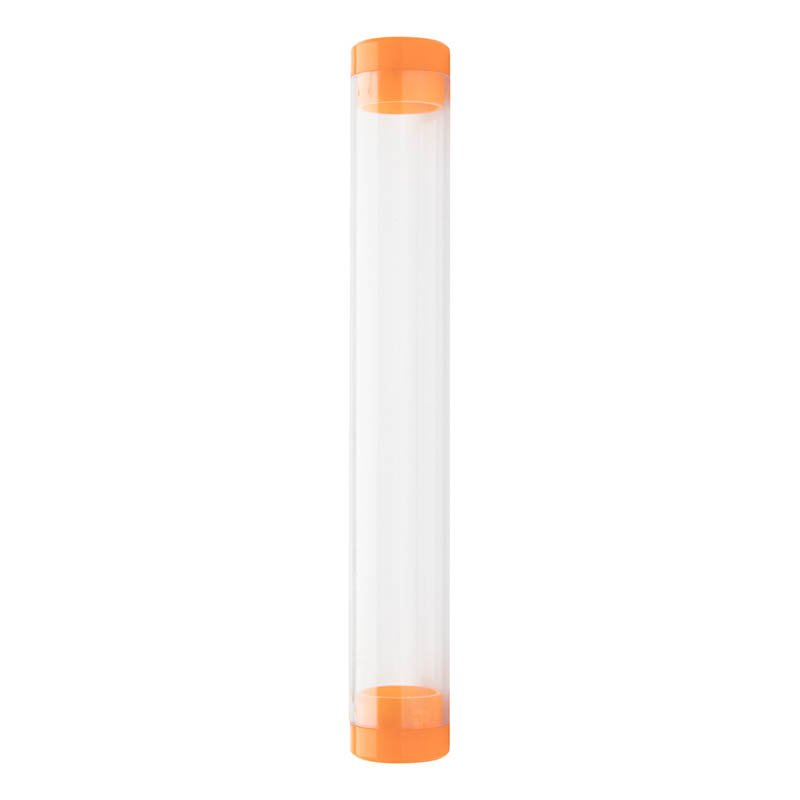 Priehľadná plastová tuba na pero s farebným uzáverom.