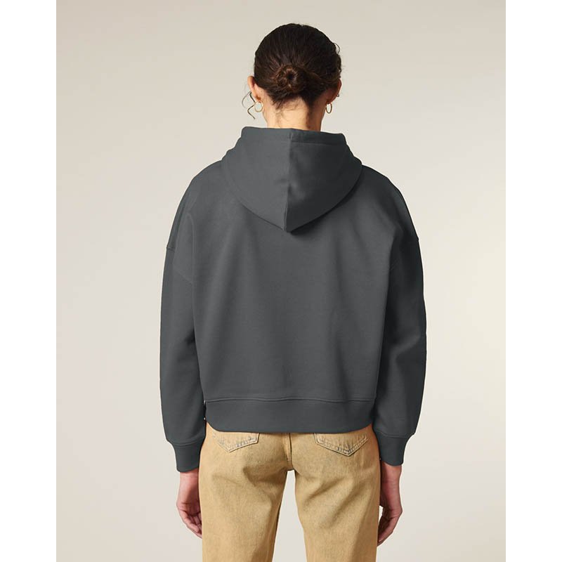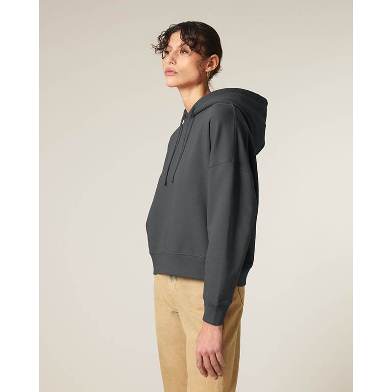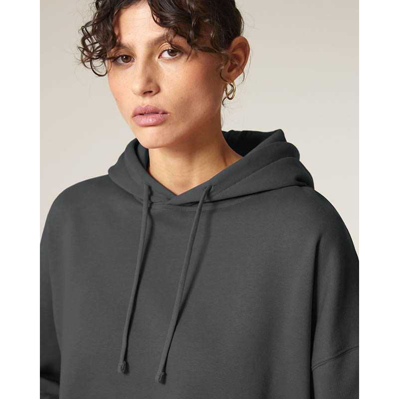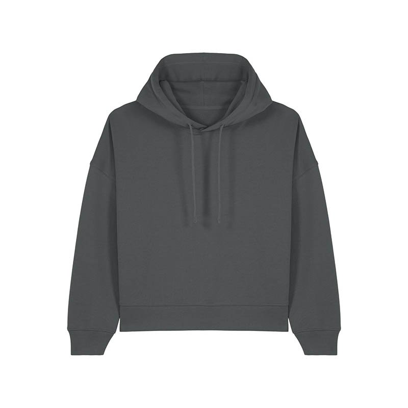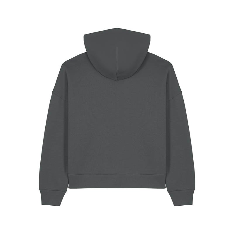 NOVINKA 2025. Set-in sleeves Dropped shoulders Double layered hood in self fabric Flat drawcord in matching body colour Embroidered eyelet 1X1 ribs at sleeves cuffs and bottom hem 2 needles topstitches on all seams Inside gros grain back neck tape Self fa