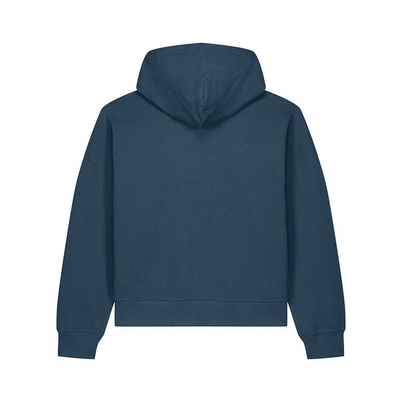 NOVINKA 2025. Set-in sleeves Dropped shoulders Double layered hood in self fabric Flat drawcord in matching body colour Embroidered eyelet 1X1 ribs at sleeves cuffs and bottom hem 2 needles topstitches on all seams Inside gros grain back neck tape Self fa