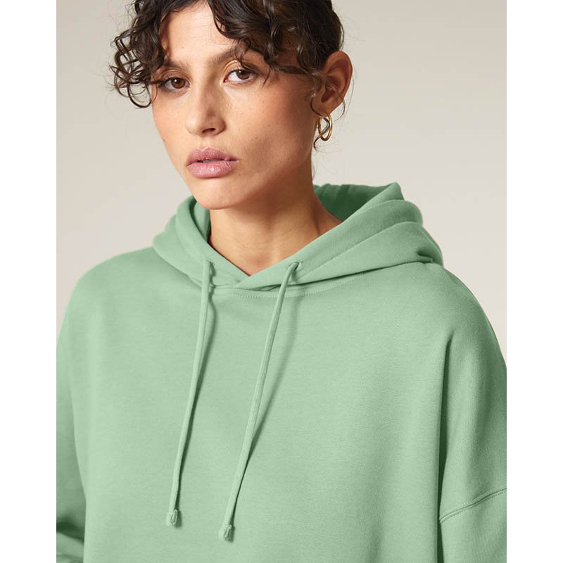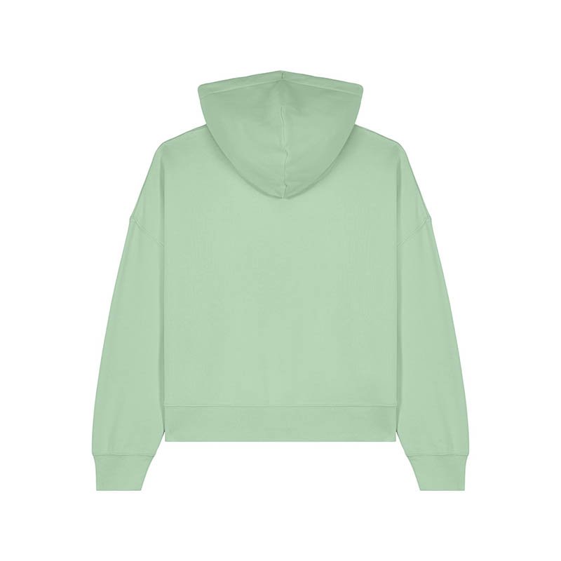 NOVINKA 2025. Set-in sleeves Dropped shoulders Double layered hood in self fabric Flat drawcord in matching body colour Embroidered eyelet 1X1 ribs at sleeves cuffs and bottom hem 2 needles topstitches on all seams Inside gros grain back neck tape Self fa
