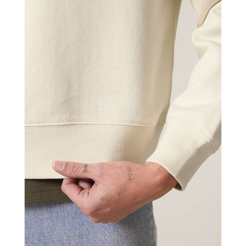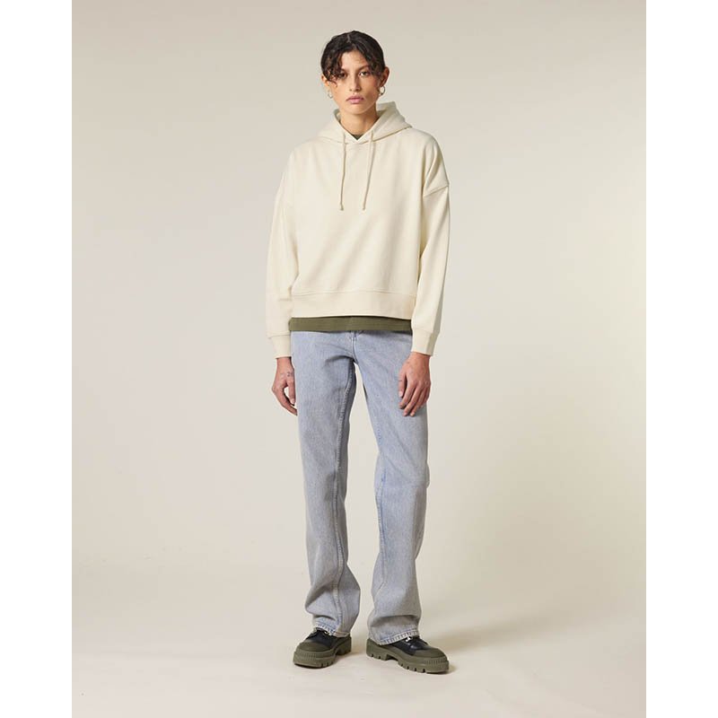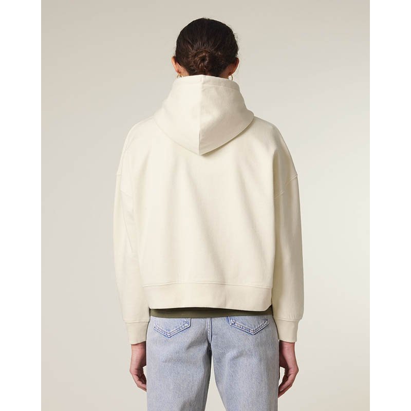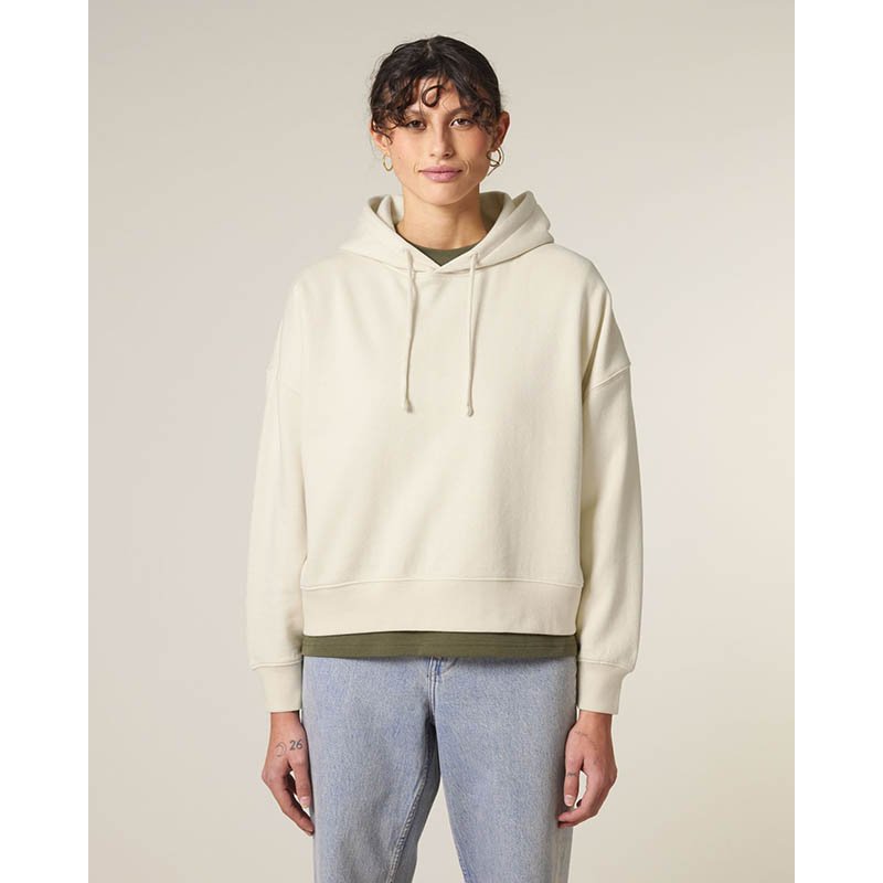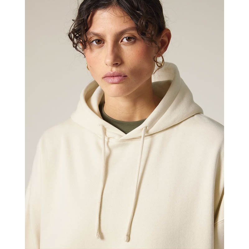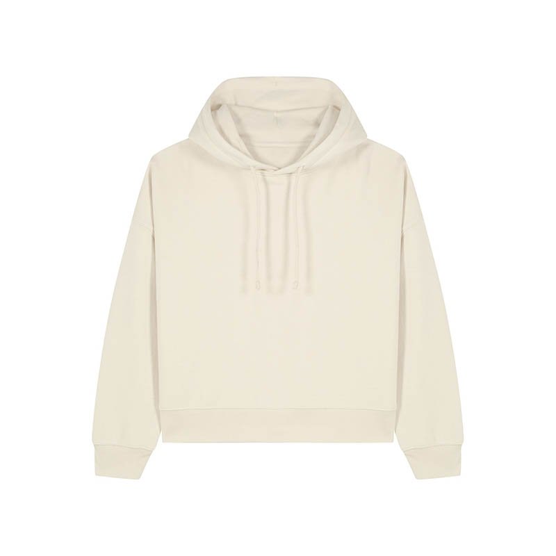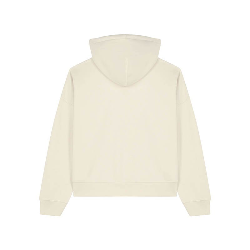 NOVINKA 2025. Set-in sleeves Dropped shoulders Double layered hood in self fabric Flat drawcord in matching body colour Embroidered eyelet 1X1 ribs at sleeves cuffs and bottom hem 2 needles topstitches on all seams Inside gros grain back neck tape Self fa