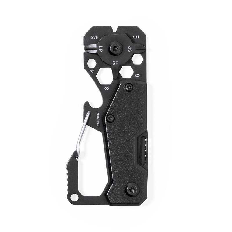 NOVINKA 2025. Superb multi-tool made of Aluminium and stainless steel with black finish. With 13 different functions: spanner for hex nuts in various sizes, carabiner, can opener, ruler, scraper, knife, flat and phillips screwdrivers. Presented in a kraft design box.