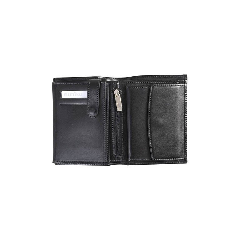 Klasická čierna čašnícka peňaženka s niekoľkými priehradkami na bankovky a veľkým priestorom na mince.8 priestorov na bankovky, 1 zadný priestor, dvojitý priestor na mince so suchým zipsom