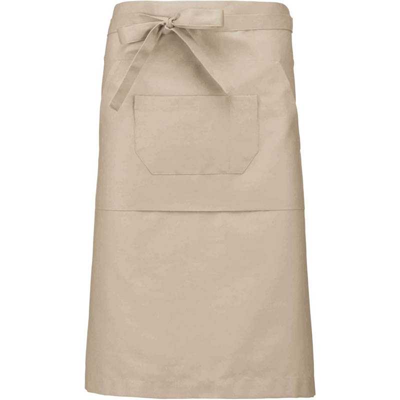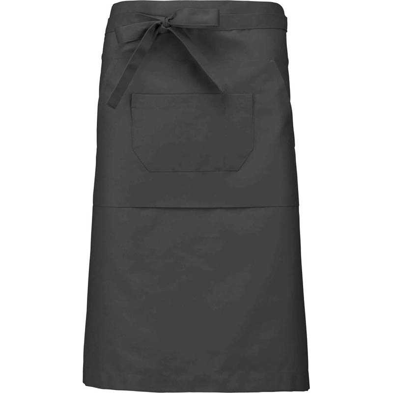 Krátká "bistro" zástěraOdolná kombinace bavlny a polyesteruZavazovací šňůra po celé délce zástěryRozměry: šířka 70 cm, délka 55 cmPraní na 60°C, možno sušit v sušičce