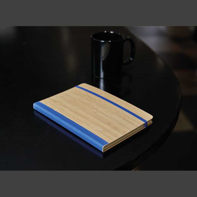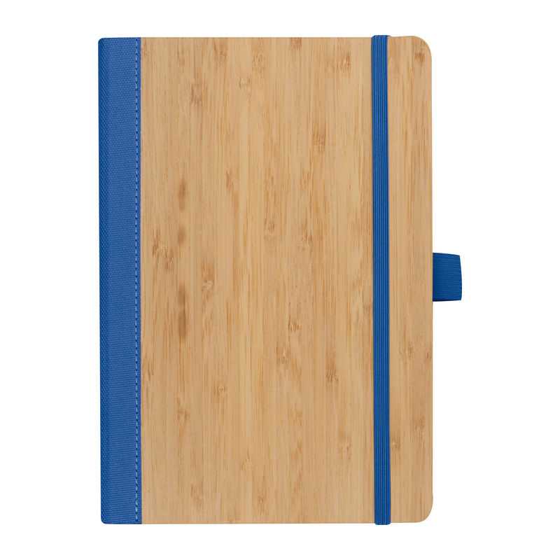 Bambusový zápisník s obalom z recyklovaného polyesteru na zadnej strane. Zápisník má 192 linajkových strán, záložku, gumičku na zapínanie a pútko na pero.