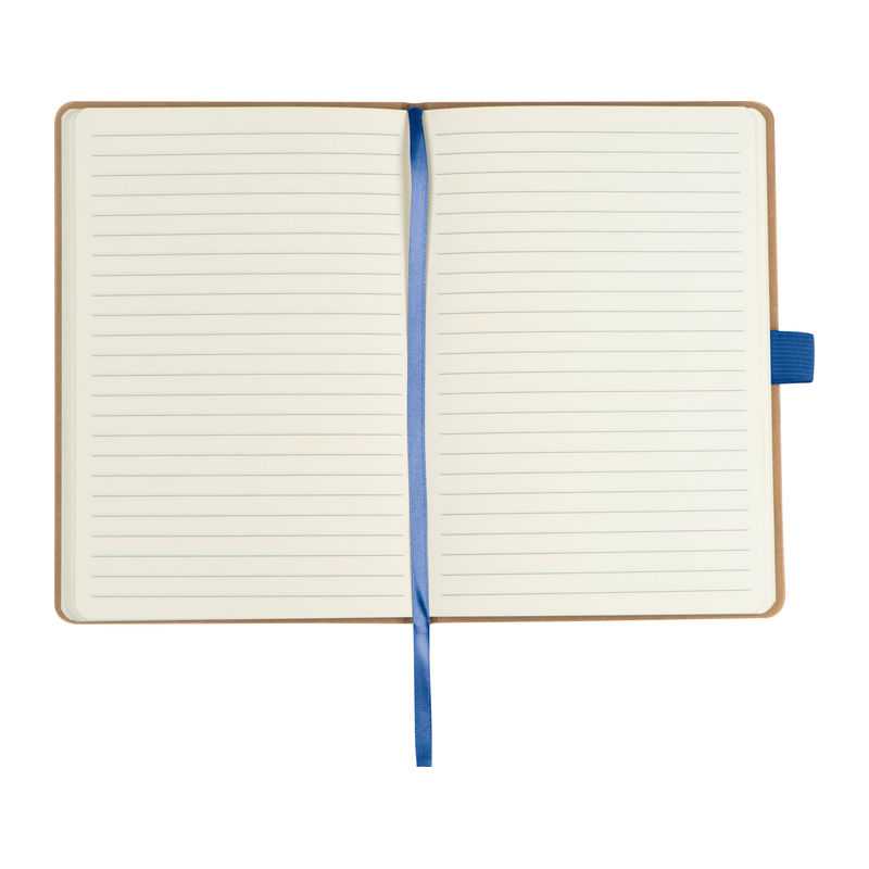 Zápisník A5 z 60% recyklovaného polyesteru a 40% PU. 256 linkovaných stran (128 listů) z recyklovaného 70g papíru. Dvě záložky z polyesterové stuhy.