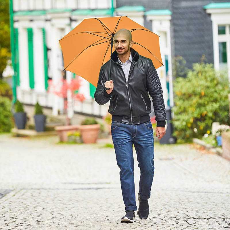 Convenient automatic function for quick opening, Windproof system for higher flexibility and stability in windy conditions, flexible fibreglass ribs, dull black plastic crook handle, higher corrosion protection due to galvanized steel shaft. Also available as golf umbrella (art. 2359).