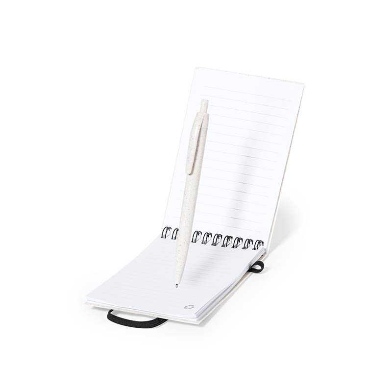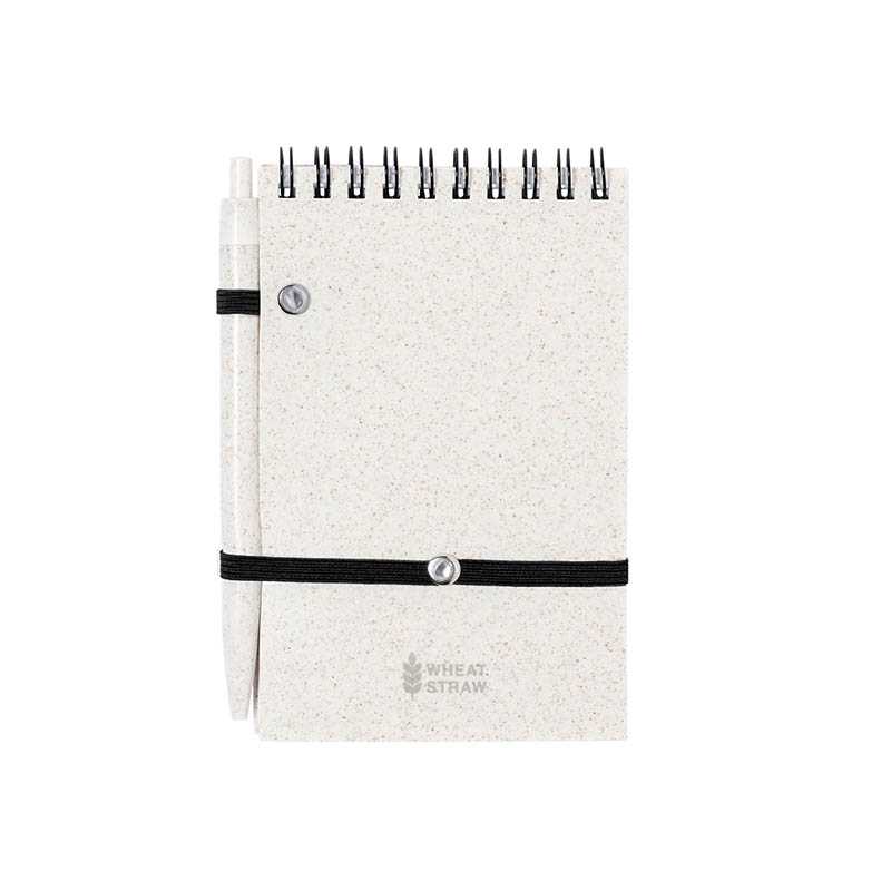 NOVINKA 2025. Set of ring notebook with wheat straw covers and matching ball pen, also in wheat straw. Compact size, with elastic closure in elegant black. Including 70 sheets with single-striped layout and eco design. Push-button mechanism ball pen in blue ink, with Wheat Straw logo. Presented in an individual recycled bag.Made with vegetal elements to encourage the use of natural raw materials and reduce pollutant emissions.