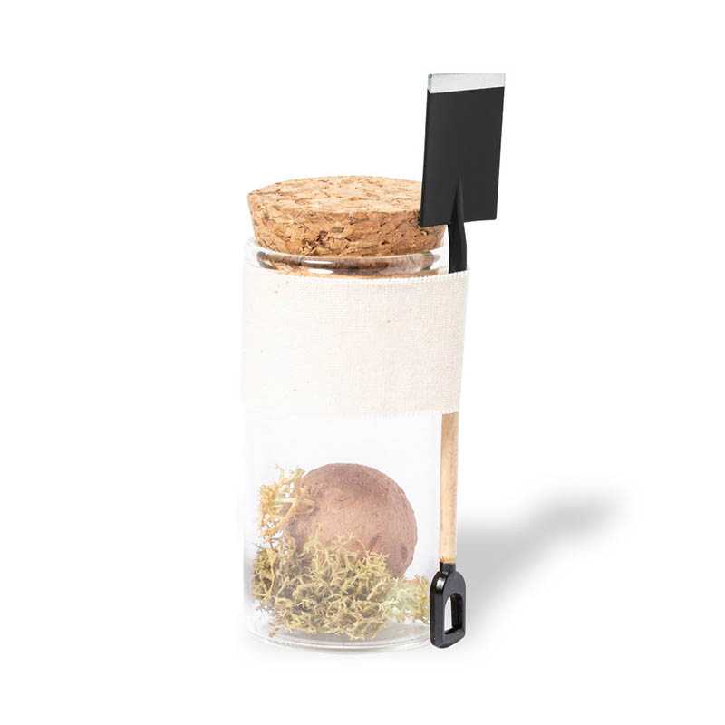 NOVINKA 2025. Nature line seed bonbon. With wild flowers and presented inside a glass jar with natural cork lid. Available in rake and shovel models.