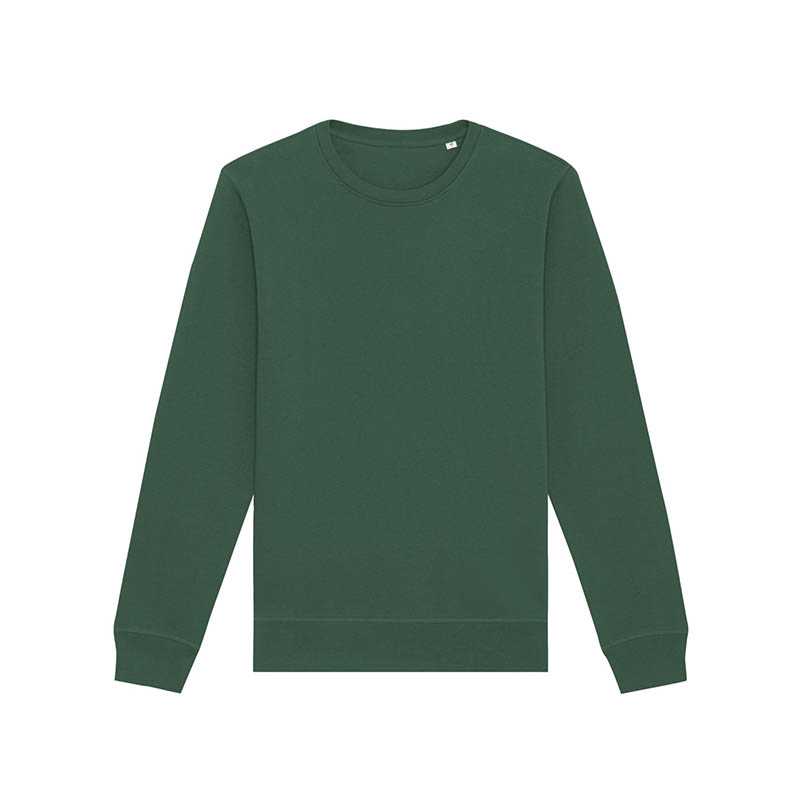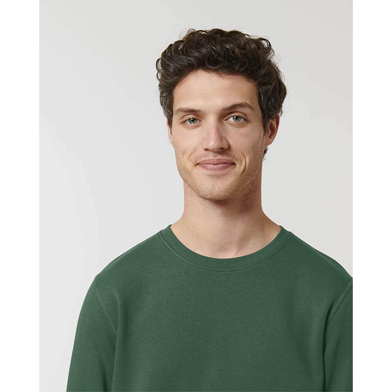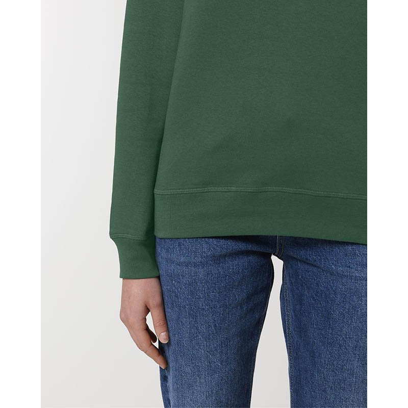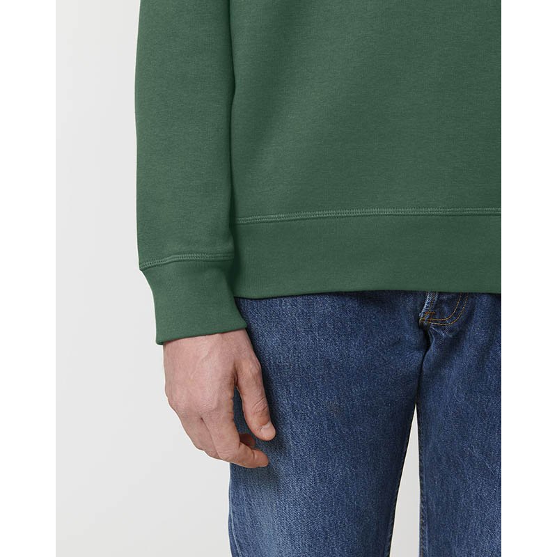 85 % organická bavlna/15 % recyklovaný polyester.Prstencovo spriadaná česaná bavlna.Rovný strih.3-vrstvový kartáčovaný flís, LSF (Low Shrinkage Fleece: predzrazený flís).1/2 kruhu vzadu.1 x 1 rebrovaný výstrih, spodný okraj a manžety.Dvojité prešívanie na manžetách, prieramkoch a spodnom okraji.Jednoduché vrchné prešívanie vo výstrihu.Podlepený výstrih vnútri na zadnej strane.
