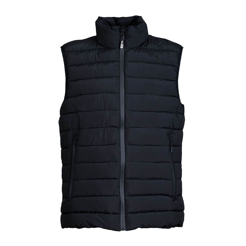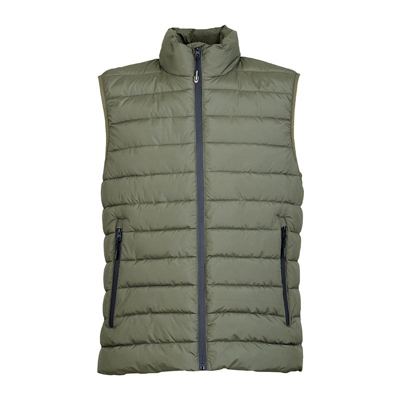 NOVINKA 2025. Composite fabric vest - Front water repellent with soft polyester padding (feather effect) - Back in 3-layer softshell fabric waterproof 3000 mm/H2O, breathability 1000 g/m2/24h - Anti-pilling microfleece lining - Inner fabric under the collar that can be lifted for customization - Laser-cut waterproof zips - Central zip with internal windproof fabric - Chin protection fabric - Two large external pockets with zip - An internal wallet pocket with zip - Stretch fabric in the armholes