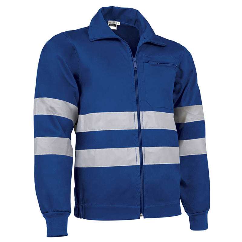 Enhanced Visibility Work Jacket. Made of a sturdy cotton twill fabric blended with polyester for strength and durability, includes two sewn reflective tapes on torso, back and sleeves to enhance user visibility. Garment certified as an Enhanced Visibility Category II PPE based on 13688 and 17353 standards, type B3 for night visibility.Stand-up collar with full-zip front closure for warmth and comfort, elasticated cuffs and side waistband for a better fit. A reinforced left chest zippered pocket for a secure and convenient storage, and showcase the branding. Suitable marking methods: screen printing, embroidery, transfer printing, vinyl application.Ideal as workwear and uniforms.