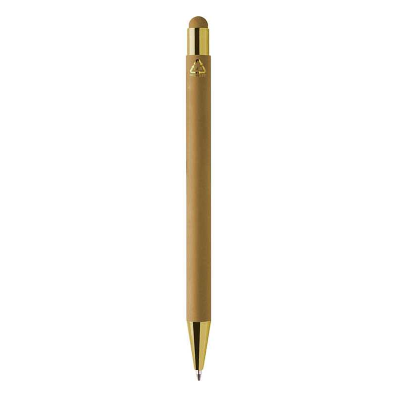NOVINKA 2025. Recyklované hliníkové guľôčkové a dotykové pero s pogumovaným telom a farebnými lesklými kovovými časťami. So špeciálnou vrstvou na zrkadlové gravírovanie zodpovedajúce kovovým častiam. S modrou náplňou.