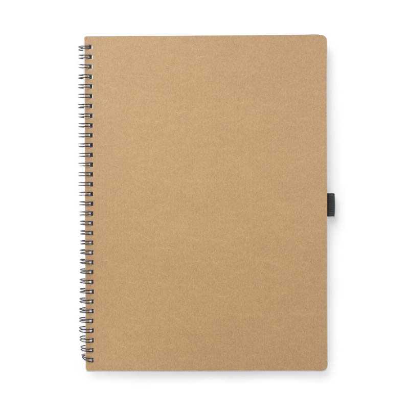 Klasický spirálový zápisník s hnědou papírovou obálkou a místem na pero. Stránky v zápisníku jsou vyrobeny z kamenného papíru. Tento papír je mimořádně trvanlivý a odolný vůči vlhkosti. Zápisník má 60 linkovaných listů, formát A4. Baleno v biologicky rozložitelném sáčku.