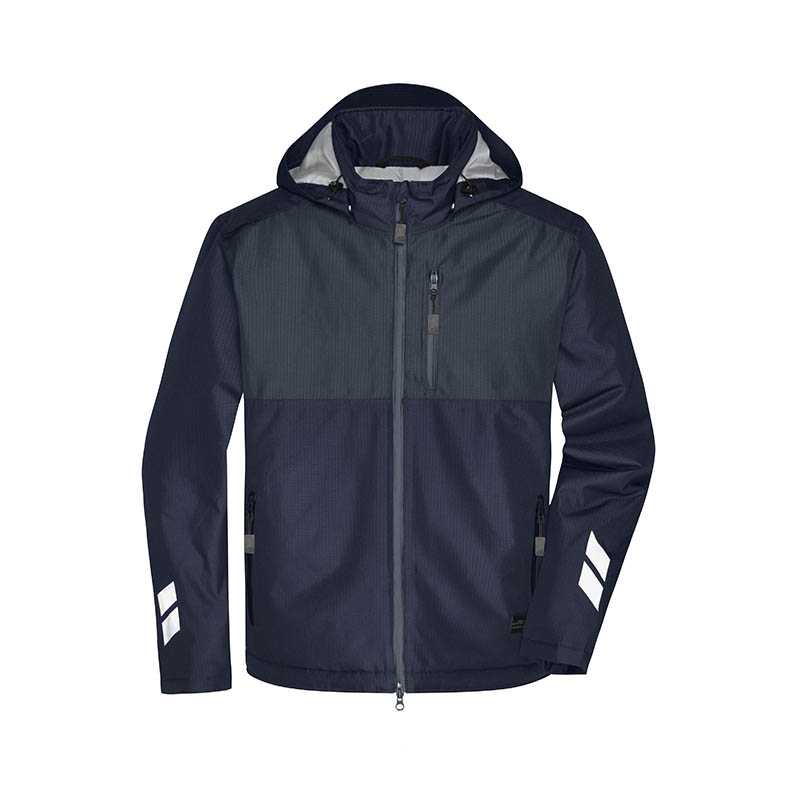 odev s vysokou viditeľnosťou, vodeodolný, vetruodolný a priedušný materiál, retroreflexné pruhy, odnimateľná kapucňa, celozapínací kostený zips s krytkou brady, vrecká s reverzným špirálovým zipsom, náprsné vrecko so vstupom pre sluchátka, lemy rukávov na