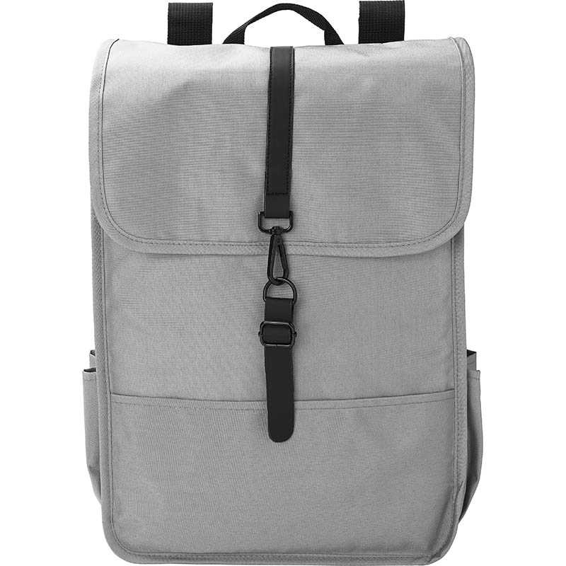 RPET Polyester (300D) flap backpack. Two bottle pockets on the side. One large compartment. With black PU strap with closing buckle.