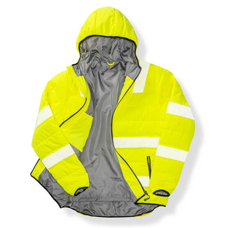 Tough, warm and recycled: a padded, printable, hooded safety jacket in water repellent finish