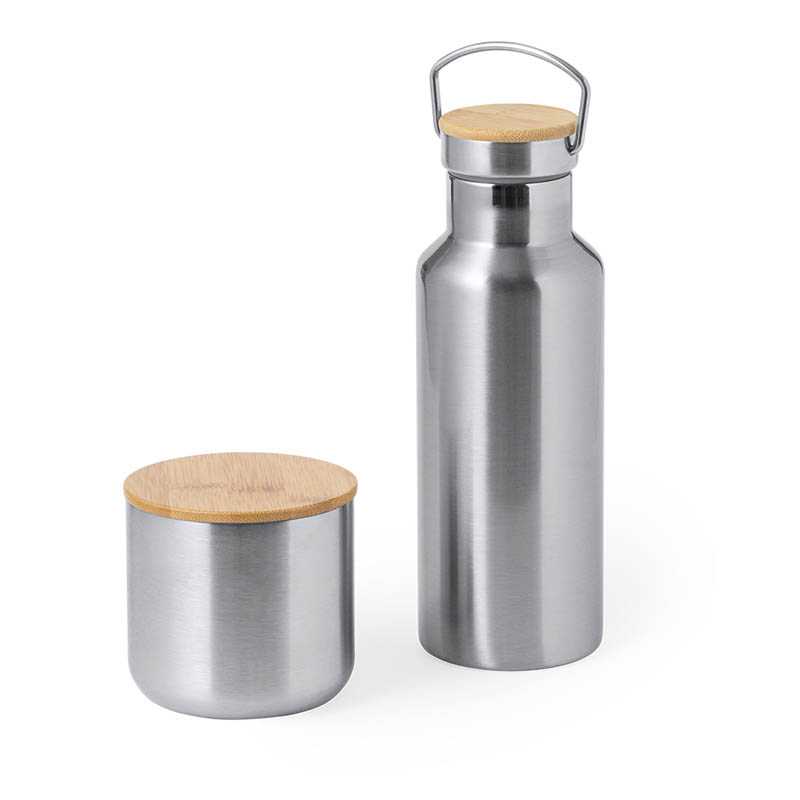 NOVINKA 2025. Useful set of thermos flask and thermal tumbler in stainless steel. Including 500 ml capacity stainless steel thermos flask, with safety screw cap, bamboo base and carrying handle. Also comes with a 300 ml capacity stainless steel tumbler with bamboo lid and push-on closure. Presented in a kraft design box.