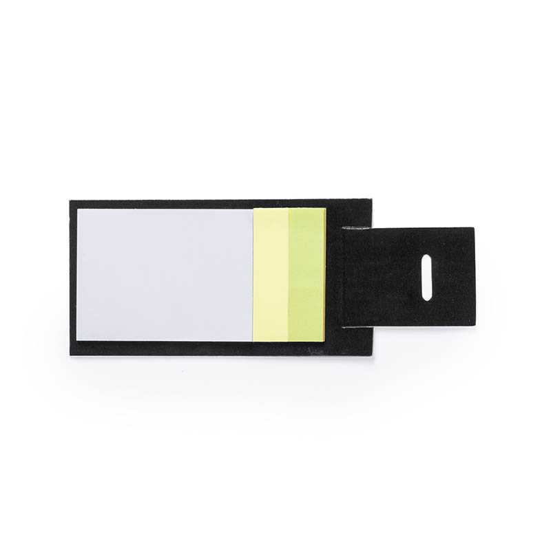 Cardboard booklet with 150 sticky notes and inside pocket for business cards. Elastic band over the cover.