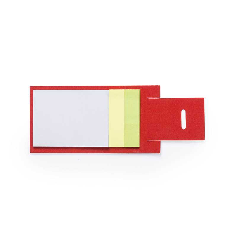 Cardboard booklet with 150 sticky notes and inside pocket for business cards. Elastic band over the cover.