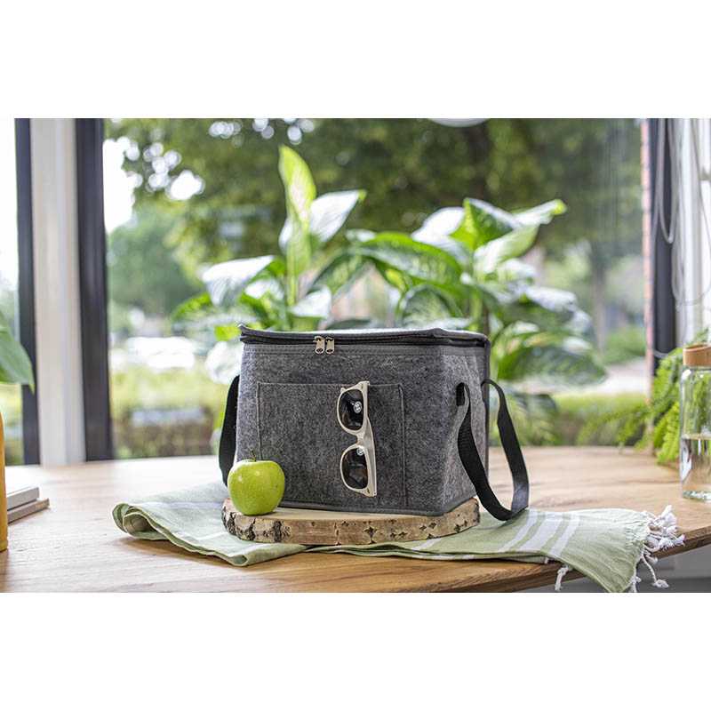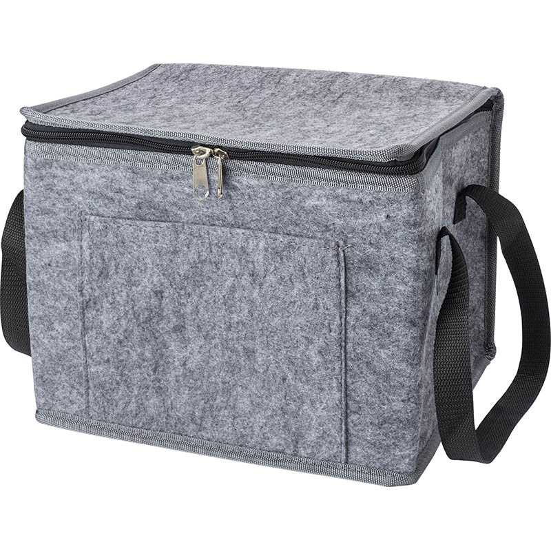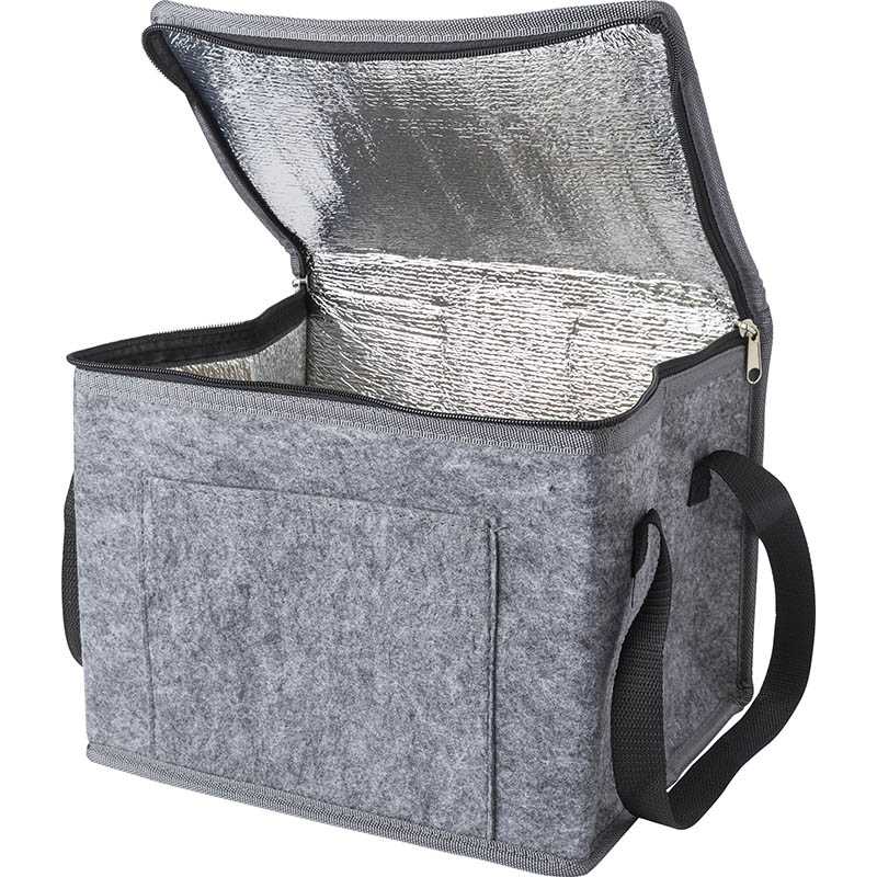 RPET felt cooler bag with aluminium foil interior and front pocket.