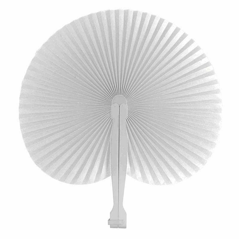 Coloured paper hand fan with white plastic handle, 26 cm long, 24 cm diameter when open