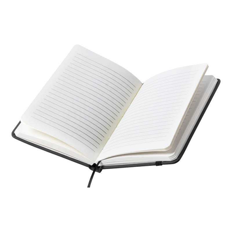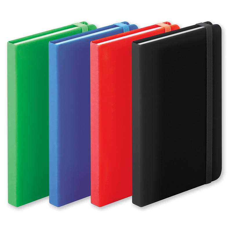 Vreckový poznámkový blok so 160 stranami bez liniek z papiera s tvrdými kartónovými doskami. Tento poznámkový blok má elastickú gumičku a záložku. 100 x 140 mm