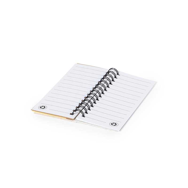 NOVINKA 2025. Notepad made in soft RPET felt. With RPET logo on cover. Including:Ring binder of 30 white sheets with single-stripe layout and recycled stamp on both sides.25 medium sticky notes.125 mini sticky notes in various colours.The recycled RPET felt is the result of the combination of the recycling process of plastic materials together with the millenary technique of felt making, resulting in an eco-trend material that, besides being of recycled origin, also becomes recyclable.Presented in an individual recycled bag.