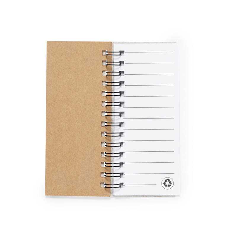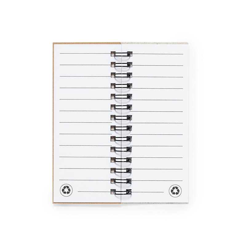 Kroužkový zápisník z recyklovaného papíru s propiskou ve stejné barvě. 140 stran recyklovaného papíru (70 listů) bez potisku. Kuličkové pero z recyklovaného papíru a biologicky rozložitelného plastu. Modrý inkoust. Elastické poutko na pero.