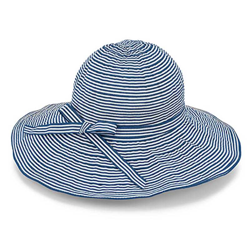 Summer hat for women in white and blue striped polyester fabric. With bow. Diameter 45 cm. In polybag