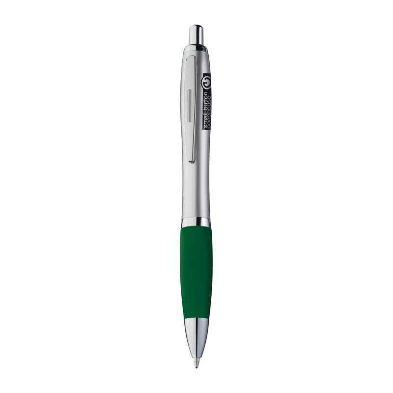 Plastové guľôčkové pero s matným strieborným telom a farebnou gumovou rukoväťou. Pero obsahuje veľkú modrú náplň.