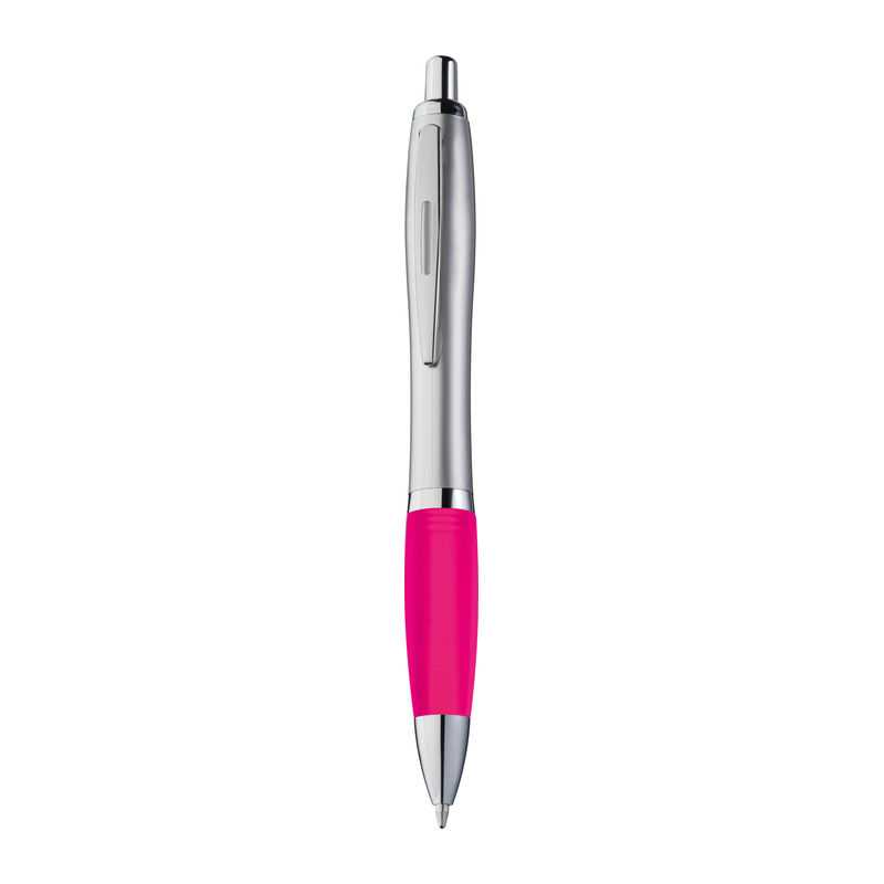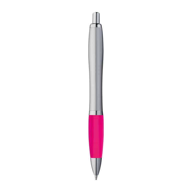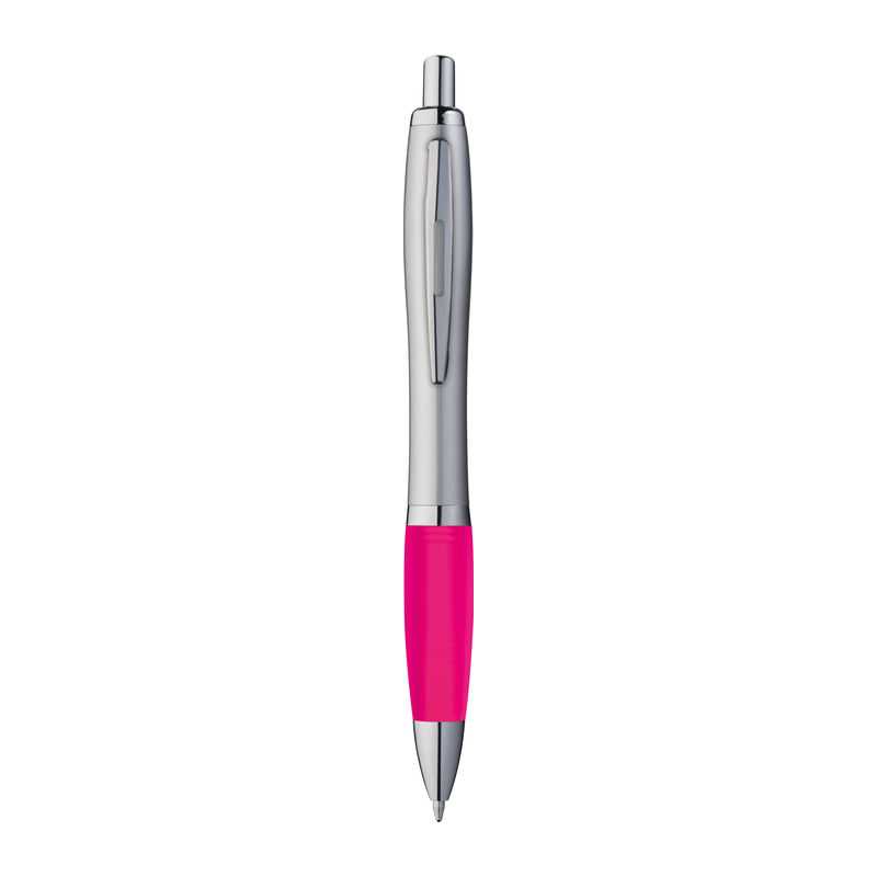 Plastové guľôčkové pero s matným strieborným telom a farebnou gumovou rukoväťou. Pero obsahuje veľkú modrú náplň.
