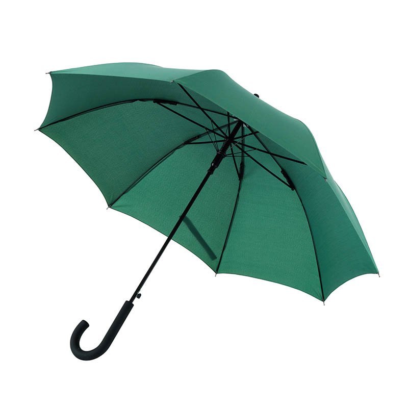 Umbrella with automatic telescopic springs. 190T polyester canopy, fibreglass frame, metal stem, soft foam handle and velcro closure.