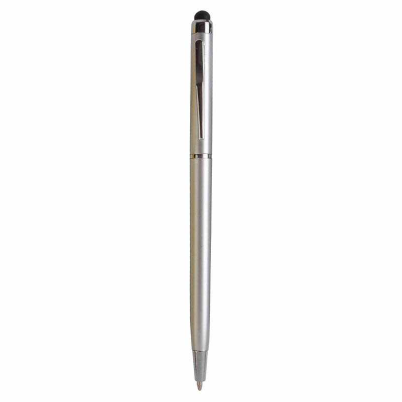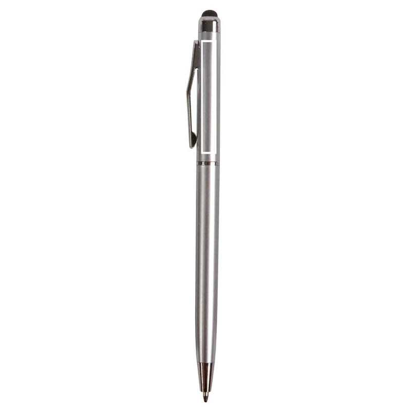 Plastové guľôčkové dotykové pero s pogumovaným úchopom a telom s matnou metalickou úpravou. Tri farebné náplne: modrá, čierna a červená.