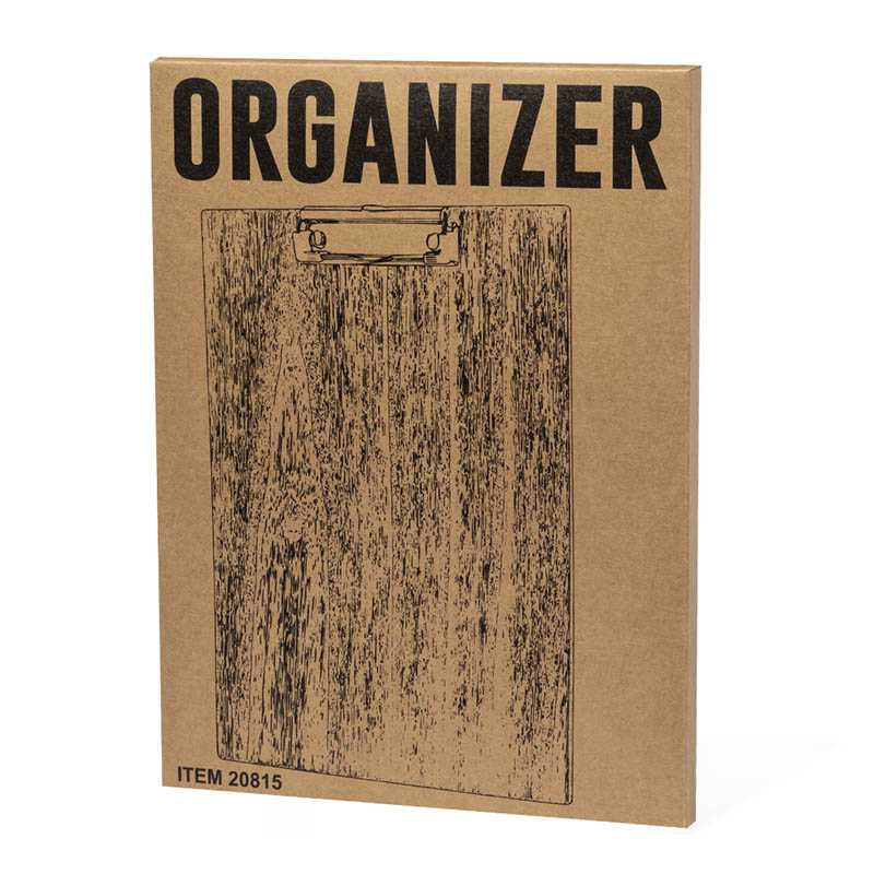NOVINKA 2025. Excellent organiser in soft wood, A4 size. With a resistant document clip and individually presented in a kraft design box.