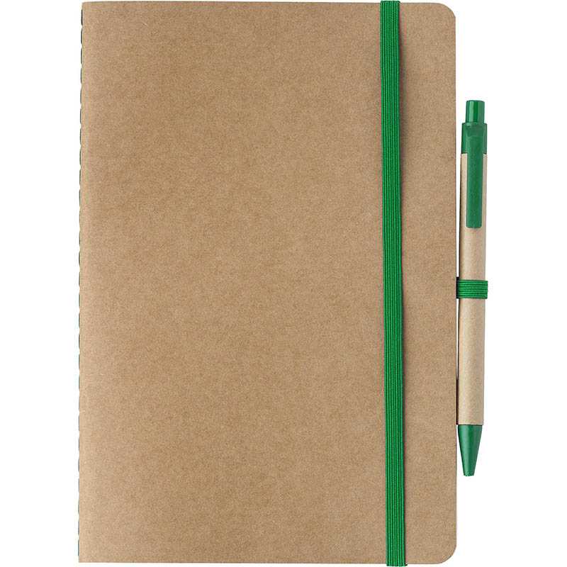 Recycled carton notebook (A5) with 120 blanc pages. With matching cardboard/wheat straw pen (blue ink) and elastic band and pen loop in same colour.