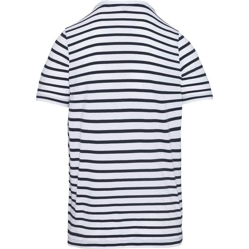 pruhy v kombinácii biela a tmavomodrá, strih s bočnými švami, úzky lem priekrčníka z rebrového úpletu 1:1 s 5 % elastanu, vnútorná časť priekrčníka začistená páskou z povrchového materiálu, spevnenie ramenných švov páskou.Single Jersey, 100 % bavlna.