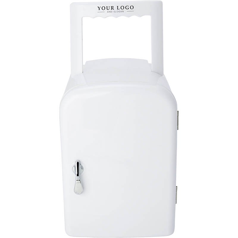 ABS mini fridge with space for six cans. Voltage: DC 12V AC 100-240V. Cooling capacity: -20 to -25 Celsius below ambient temperature (lowest temperature is around -2 Celcius). Heating capacity: 50 Celsius.