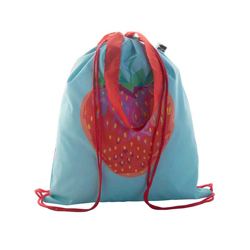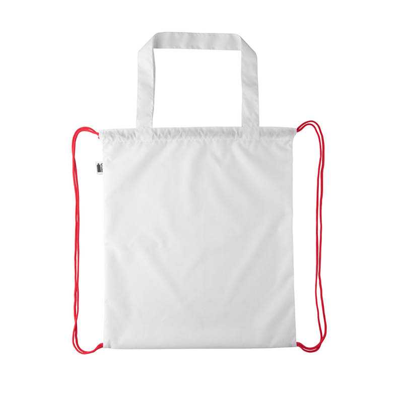 Taška s farebnými šnúrkami a dlhými rúčkami na zákazku, 190T RPET polyester. Môže byť použitý aj ako nákupná taška. S celoplošnou sublimačnou potlačou a výrazným štítkom RPET. Min.mn.: 50 ks.