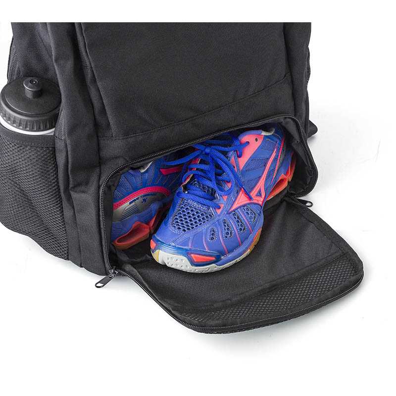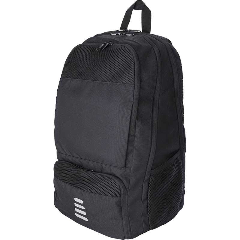 RPET polyester multi-functional backpack. 210D lining and RPET 600D outside. Function include: racket pocket, anti-theft pocket, shoe pocket, laptop pocket, bottle compartments. The bag has padded adjustable straps and is water repellent (recycled coatin