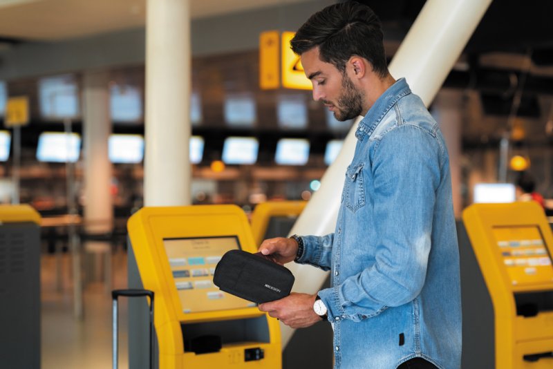 Cestovná peňaženka s priestorom na uchovanie cestovného pasu a ďalších cenností. Predné vrecko na magnetické zatváranie s RFID ochranou pre uchovanie cestovného pasu. Špeciálna funkcia umožňuje využitie ako stojanček na telefón na sledovanie filmov na cestách. Vnútorný úschovný priestor 3 v 1 možno využiť ako peňaženku alebo obal na telefón. Pasuje na veľkosť až 5,5". Vyrobené z recyklovaných materiálov Registrovaný dizajn®.